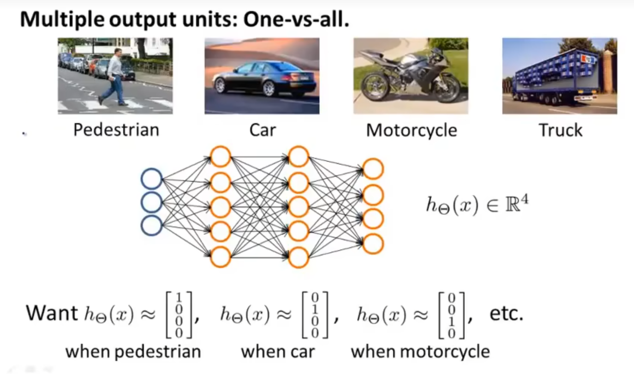 对于上例,我们构造了一个输出层有四个神经元的神经网络,则神经网络的输出将会是一个含有四个数的向量 hΘ(x)∈R4,当数据分别属于不同的类别时,我们希望其能激活不同的输出单元来表示预测的结果,这与逻辑回归中的一对多法非常类似。